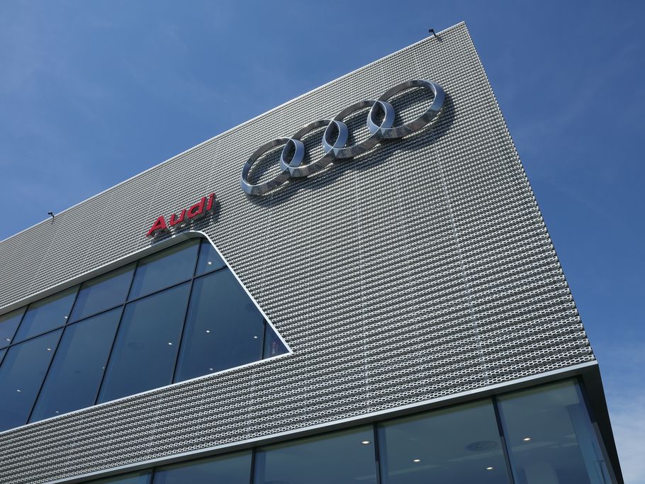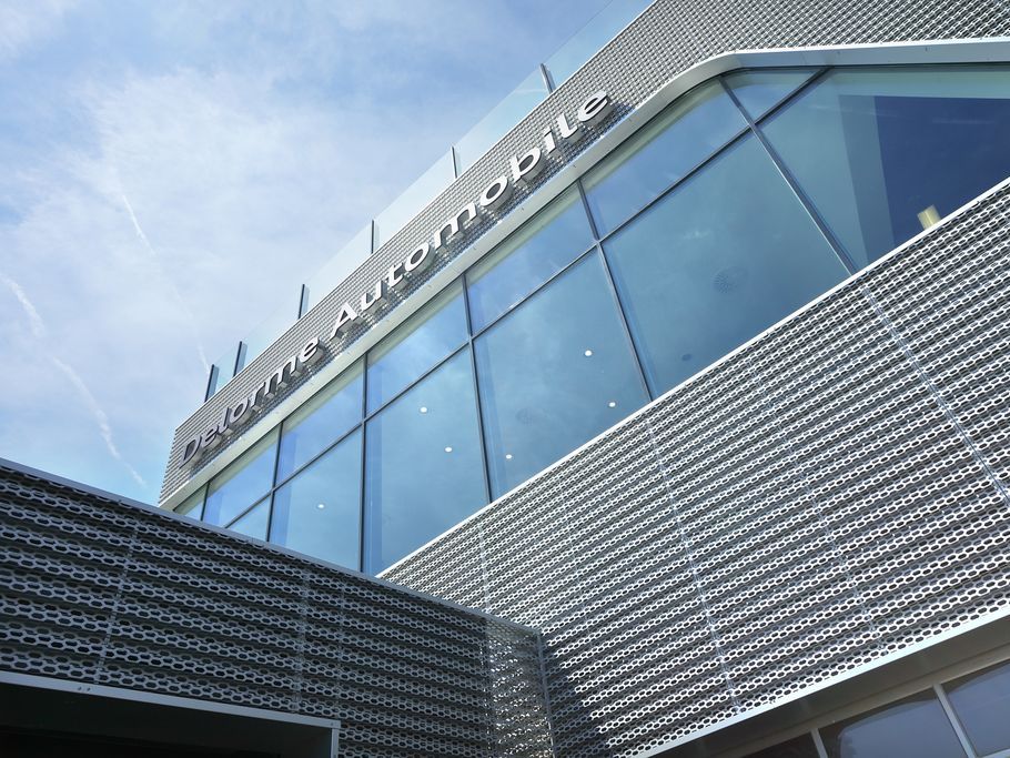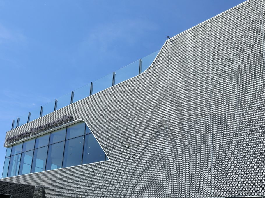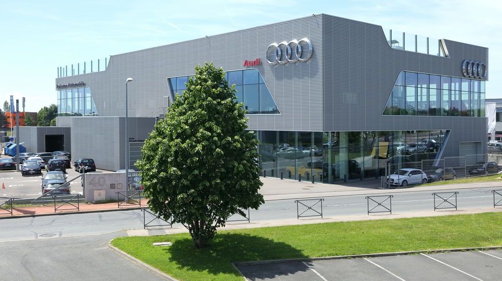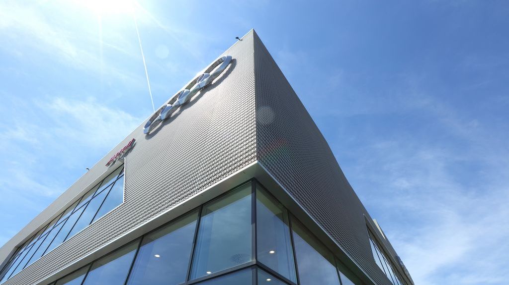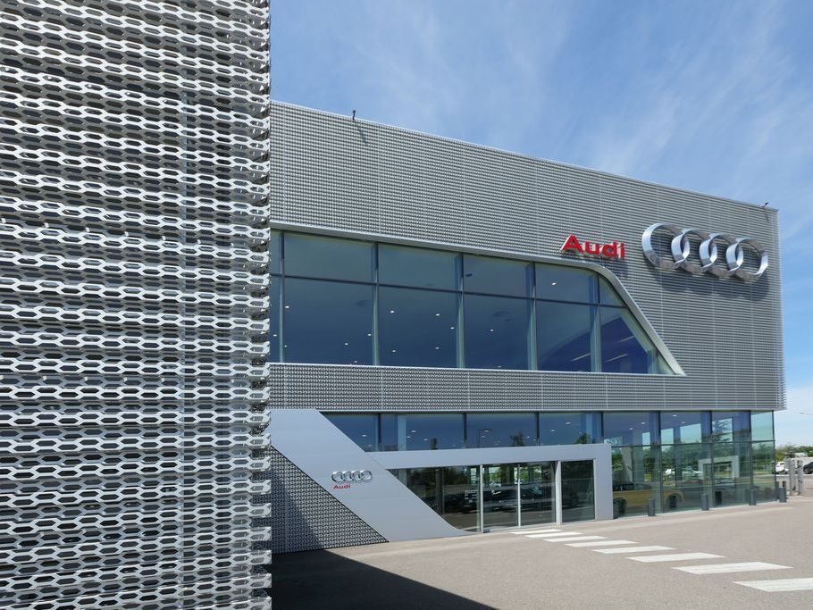 La nouvelle facade des maisons de vente Audi patentée est realisée en aluminium de haute qualité avec une surface anodisée et perforée hexagonalement en quinconce, est un élément essentiel des nouveaux bâtiments de présentation. La façade superposée, ouverte et ventilée est la principale caractéristique du nouveau design, est realisée de Dillinger France Perforation S.a.r.l